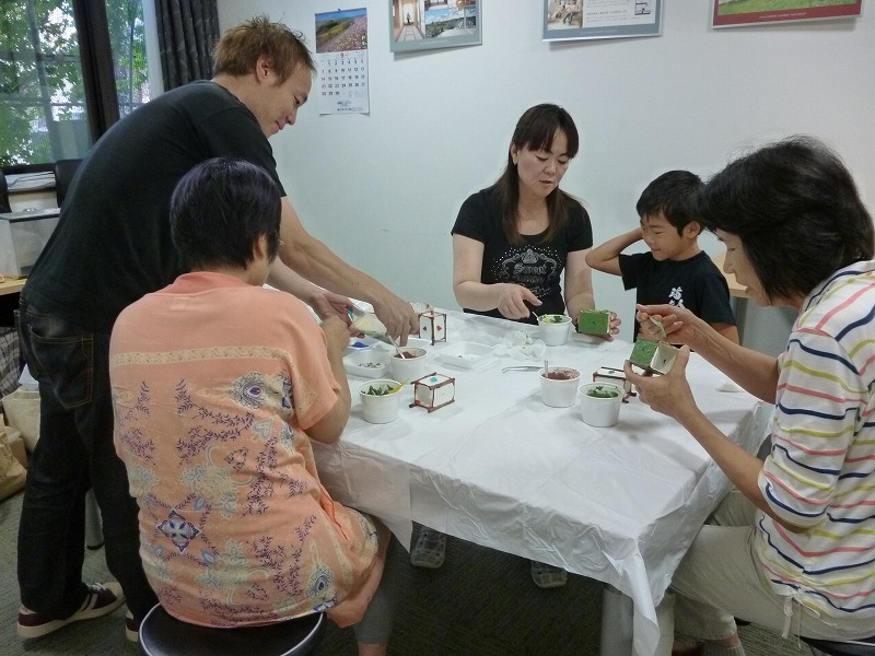 そんなすばらしい機能を持つ珪藻土を、今回はランプシェードの土台に塗り、自由に飾り付けしました。自分で材料を練り、薄く延ばしながら塗るのは簡単なようで意外とコツがいる…ようでしたが、みなさん和やかな雰囲気のなか、和気あいあいと楽しく会話しながら体験していただきました。